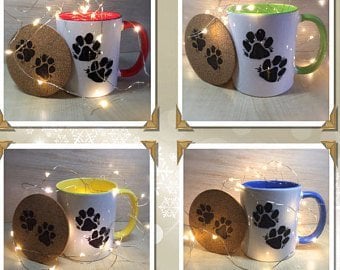 Paw Print ceramic mugs with hand decorated coaster and choccy treat!